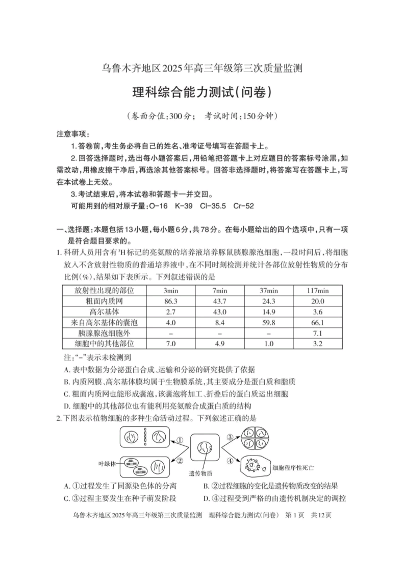 新疆乌鲁木齐地区2024-2025学年高三三模质量监测理科综合