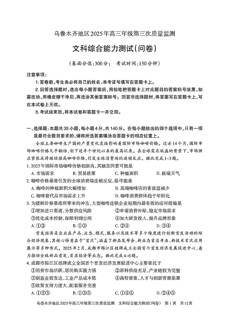 新疆乌鲁木齐地区2024-2025学年高三三模质量监测文科综合+答案