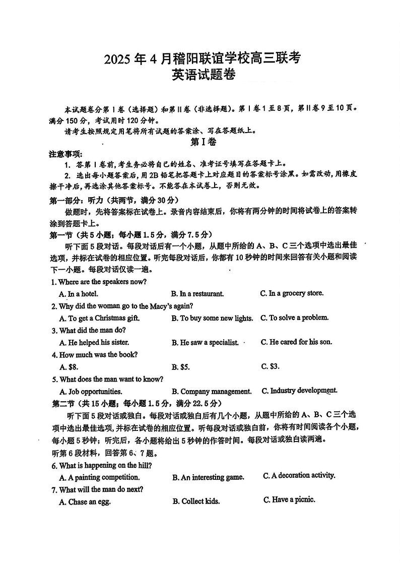 浙江省稽阳联谊学校2024-2025学年下学期4月高三联考英语+答案