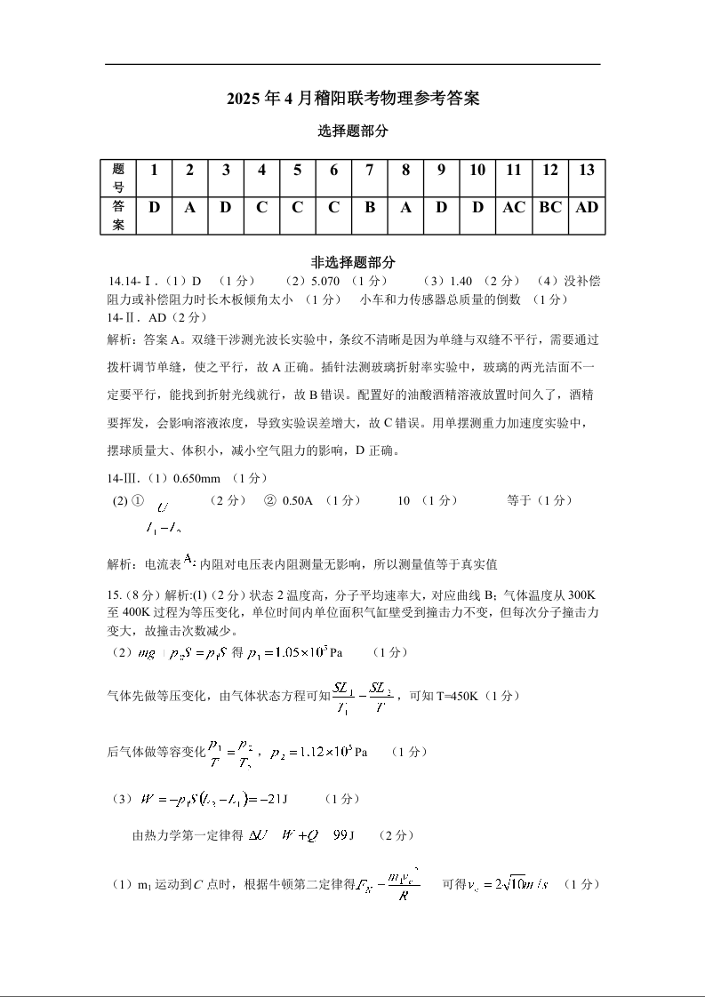 浙江省稽阳联谊学校2024-2025学年下学期4月高三联考物理答案