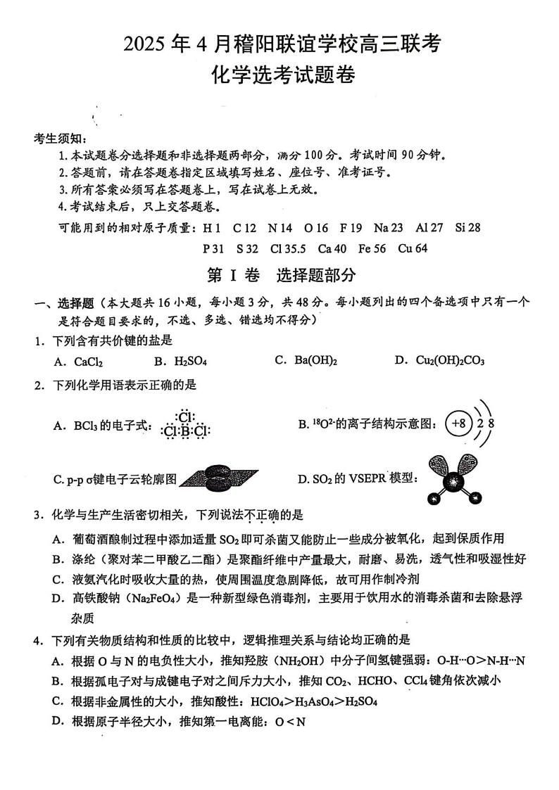 浙江省稽阳联谊学校2024-2025学年下学期4月高三联考化学+答案