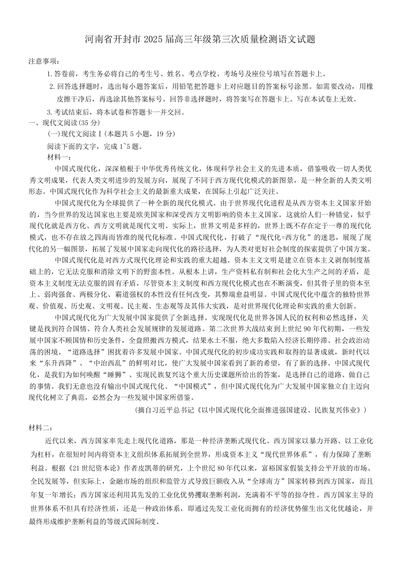 河南省开封市2024-2025学年下学期高三三模质量检测语文+答案