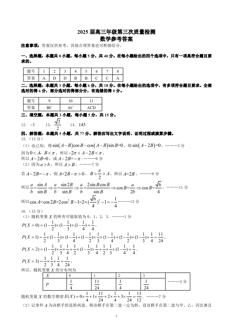 河南省开封市2024-2025学年下学期高三三模质量检测数学答案