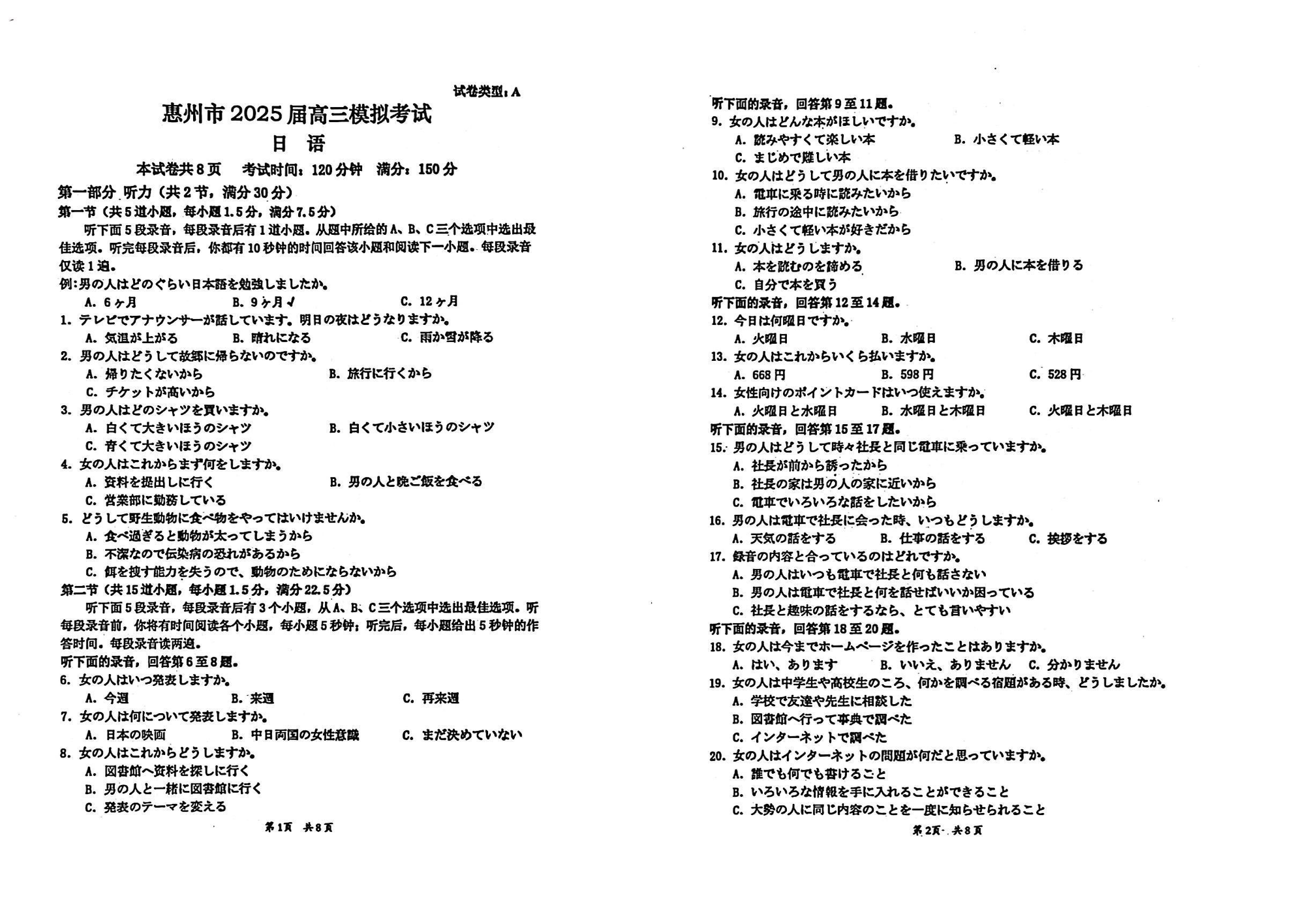 广东省惠州市2024-2025学年下学期4月高三二模考试日语+答案