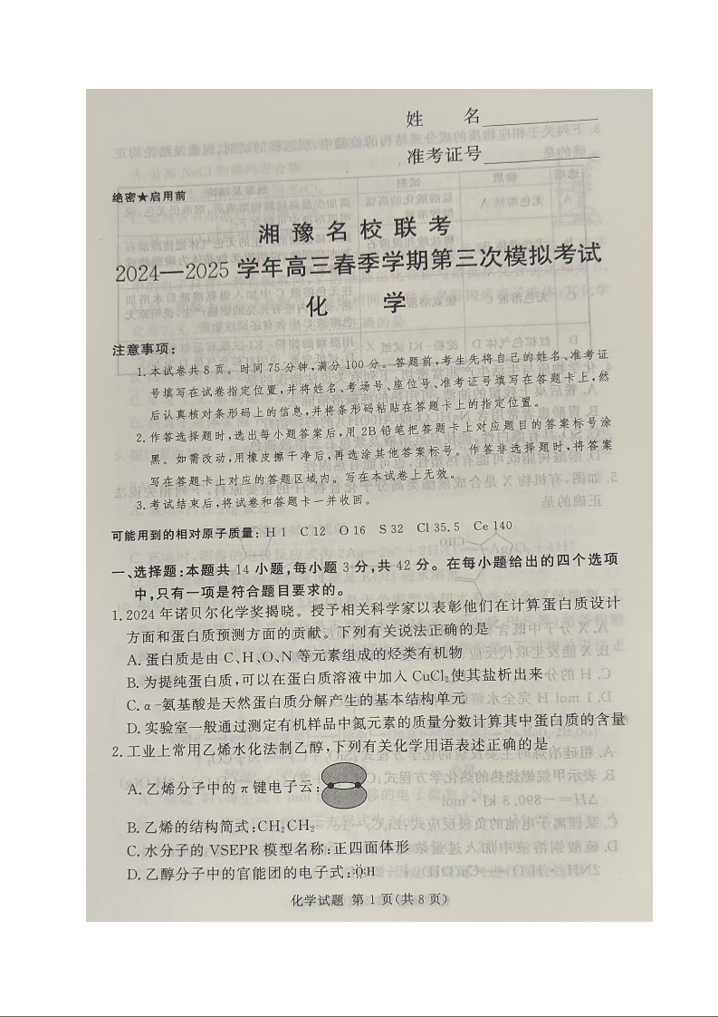 湘豫名校联考2024-2025学年下学期春季高三第三次模拟考试化学
