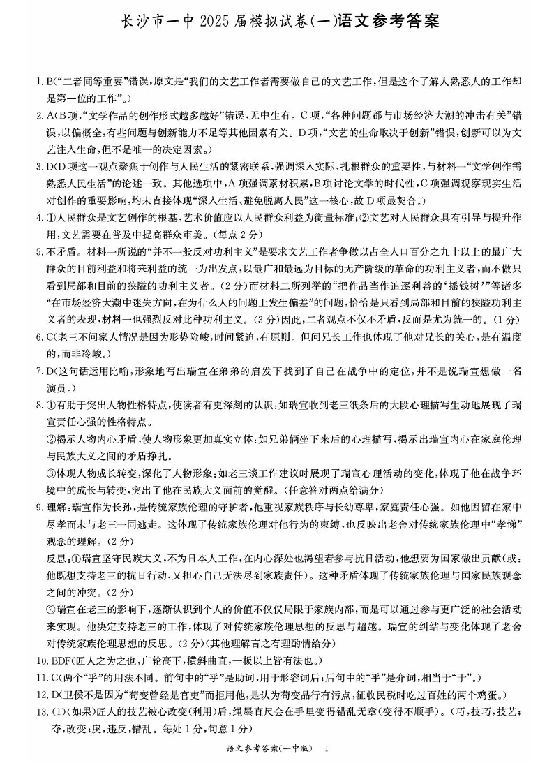 湖南省长沙市一中2024-2025学年下学期高三模拟(一)语文答案