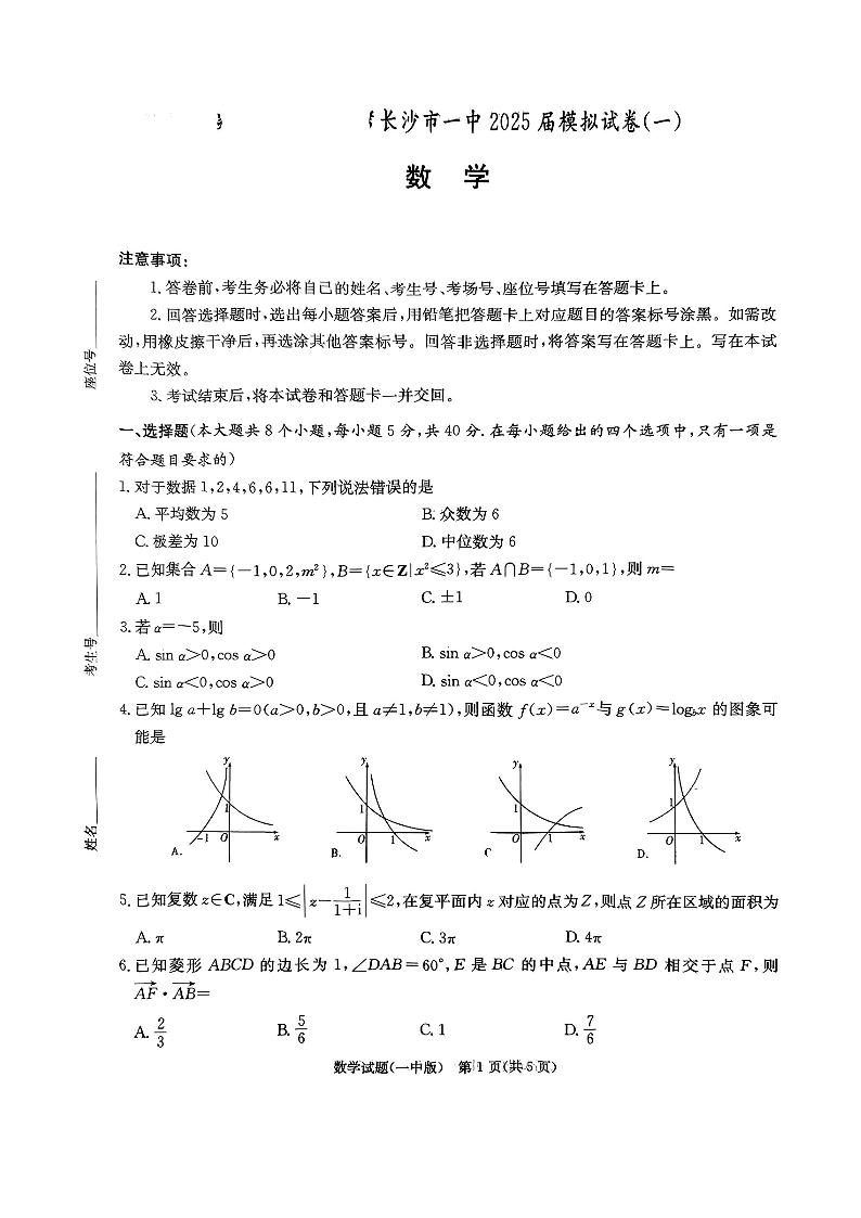 湖南省长沙市一中2024-2025学年下学期高三模拟(一)数学
