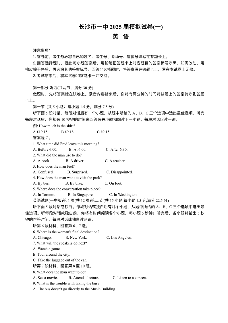 湖南省长沙市一中2024-2025学年下学期高三模拟(一)英语+答案