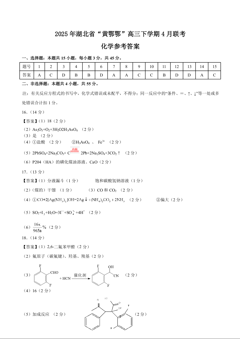湖北省“黄鄂鄂”2024-2025年学年下学期4月高三联考化学答案