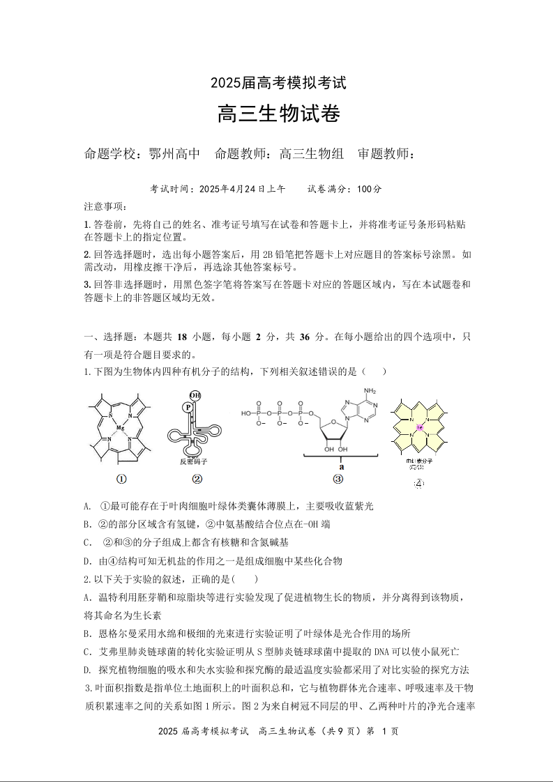 湖北省“黄鄂鄂”2024-2025年学年下学期4月高三联考生物