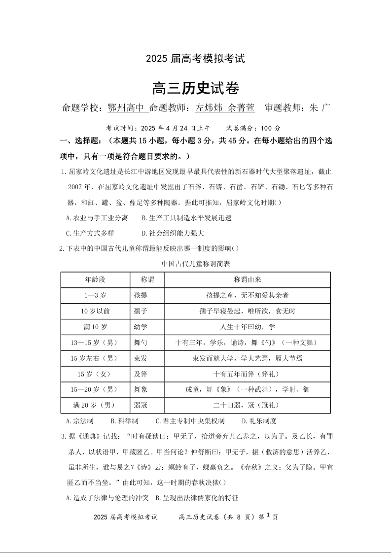 湖北省“黄鄂鄂”2024-2025年学年下学期4月高三联考历史
