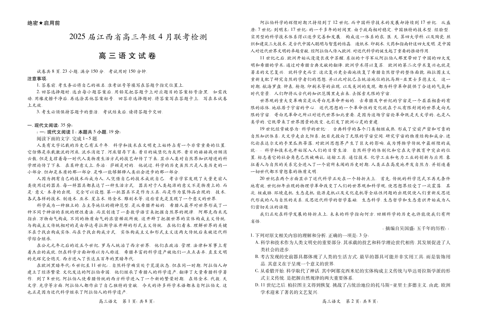 江西省上进联考2024-2025学年4月高三联考检测语文