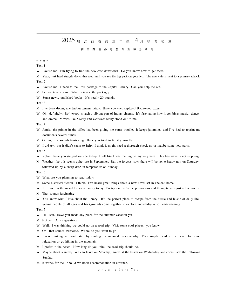 江西省上进联考2024-2025学年4月高三联考检测英语答案