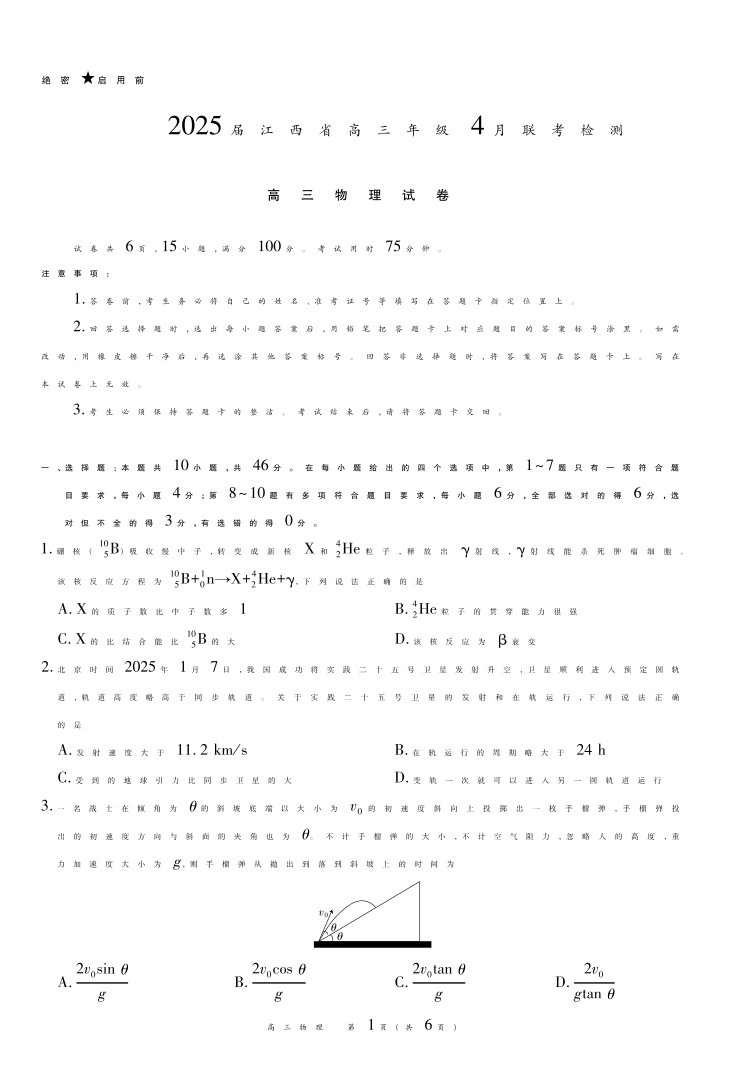 江西省上进联考2024-2025学年4月高三联考检测物理