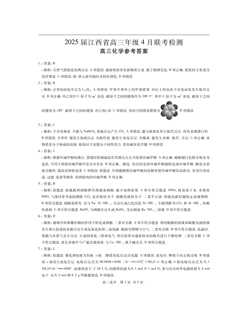 江西省上进联考2024-2025学年4月高三联考检测化学答案