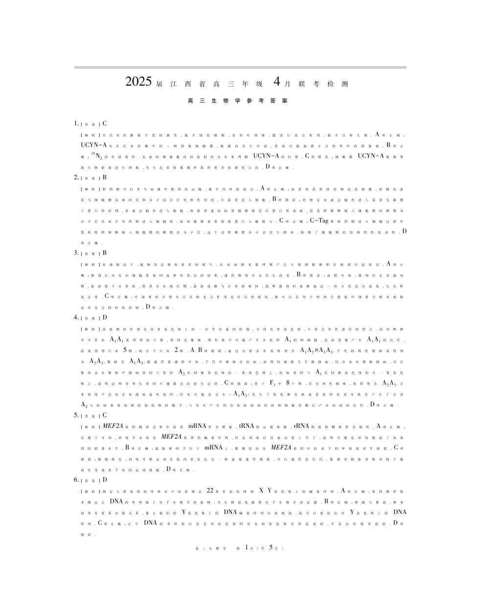 江西省上进联考2024-2025学年4月高三联考检测生物答案