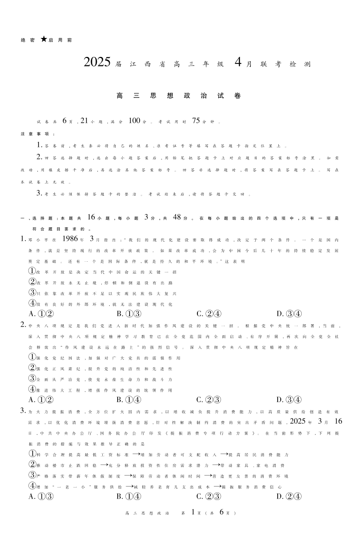 江西省上进联考2024-2025学年4月高三联考检测政治