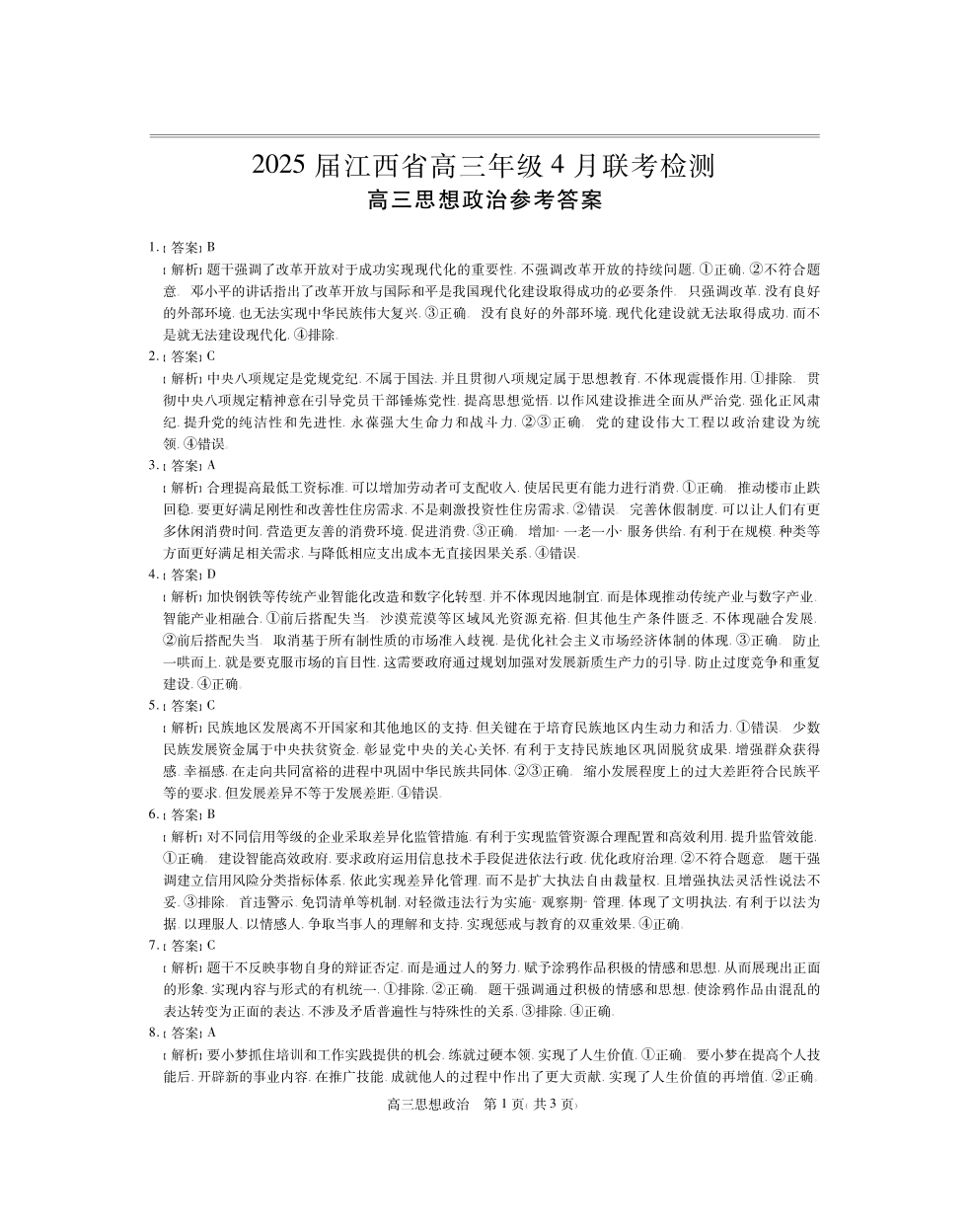 江西省上进联考2024-2025学年4月高三联考检测政治答案
