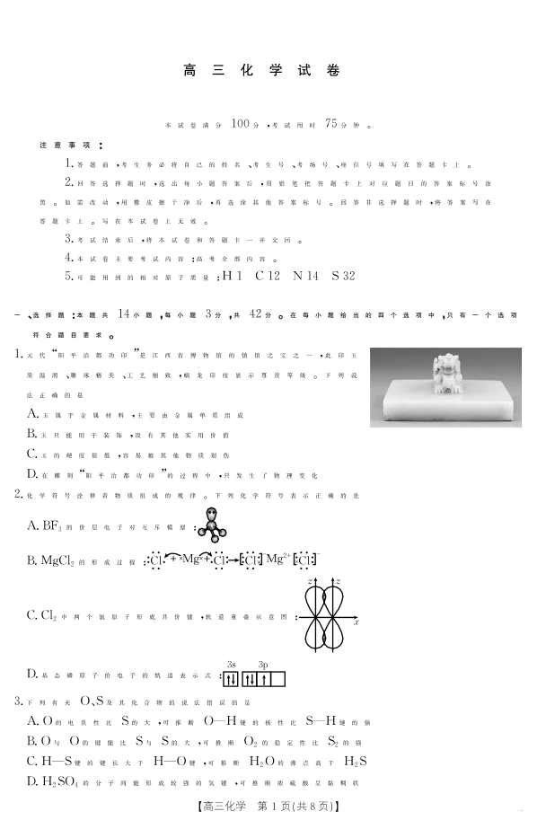 江西省区域高中2024-2025学年下学期4月高三联考化学