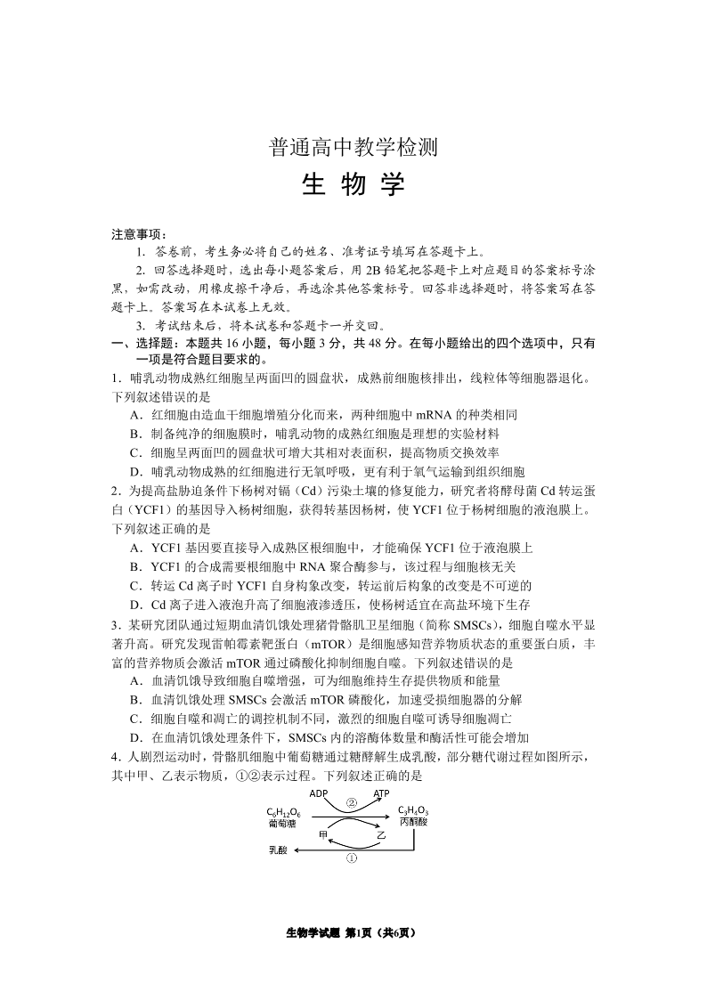 贵州省区域2024-2025学年基础教育质量提升高三教学检测生物