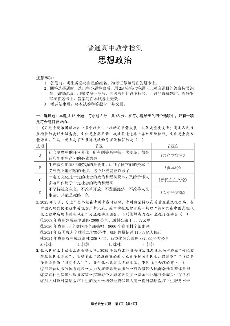 贵州省区域2024-2025学年基础教育质量提升高三教学检测政治