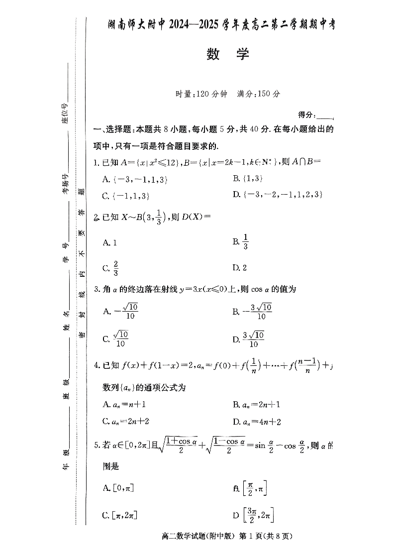 湖南省师大附中2024-2025学年下学期高二期中数学+答案