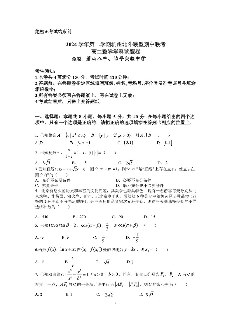 浙江省杭州市北斗联盟2024-2025学年下学期4月高二期中联考数学