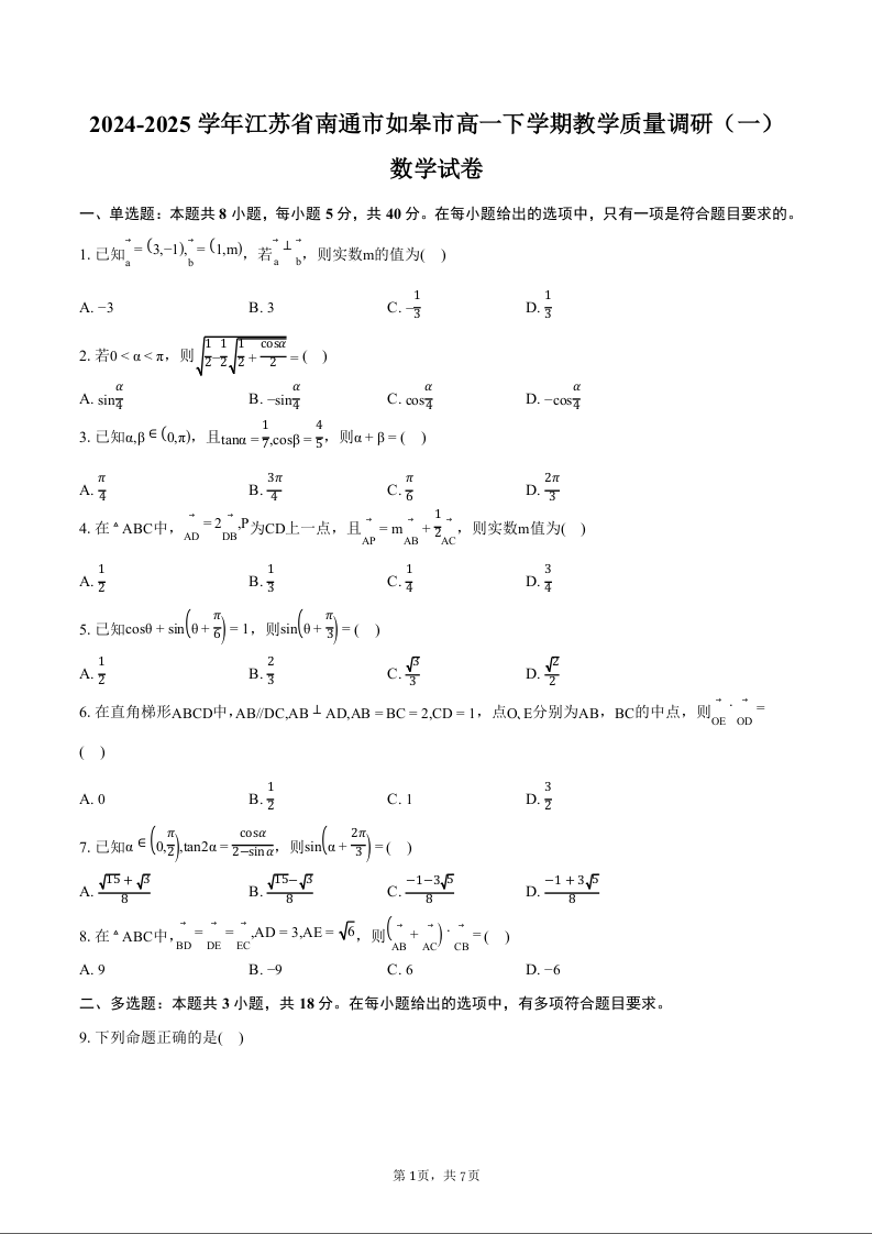 江苏省南通市如皋市2024-2025学年下学期高一教学质量调研(一)数学+答案