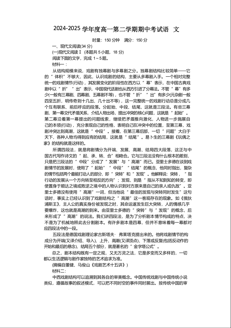 湖南省师大附中2024-2025学年下学期4月高一期中语文+答案