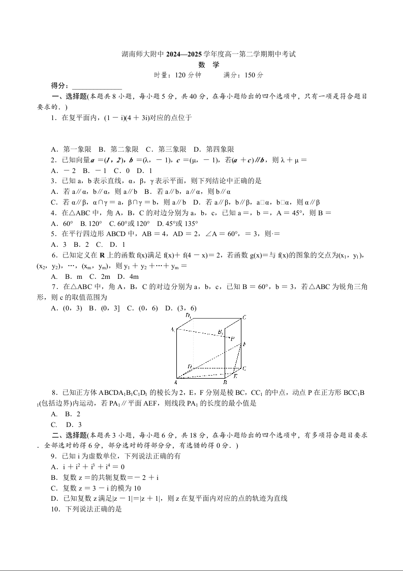 湖南省师大附中2024-2025学年下学期4月高一期中数学