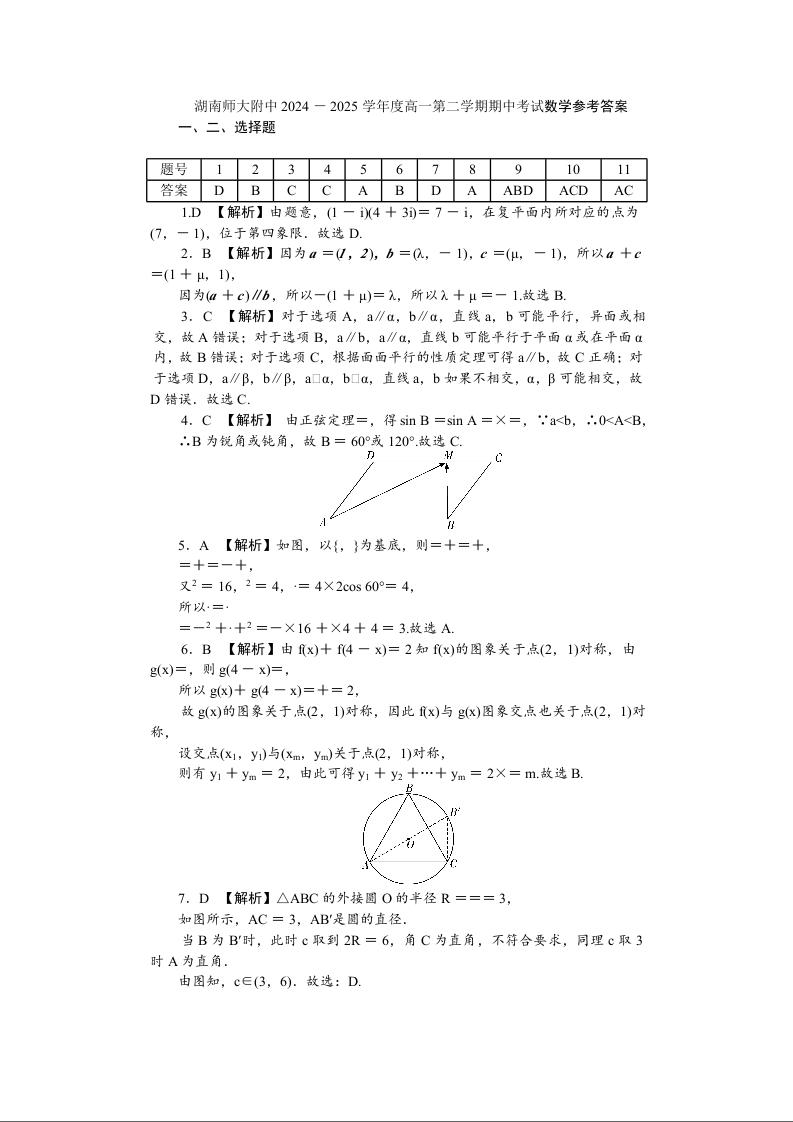 湖南省师大附中2024-2025学年下学期4月高一期中数学答案
