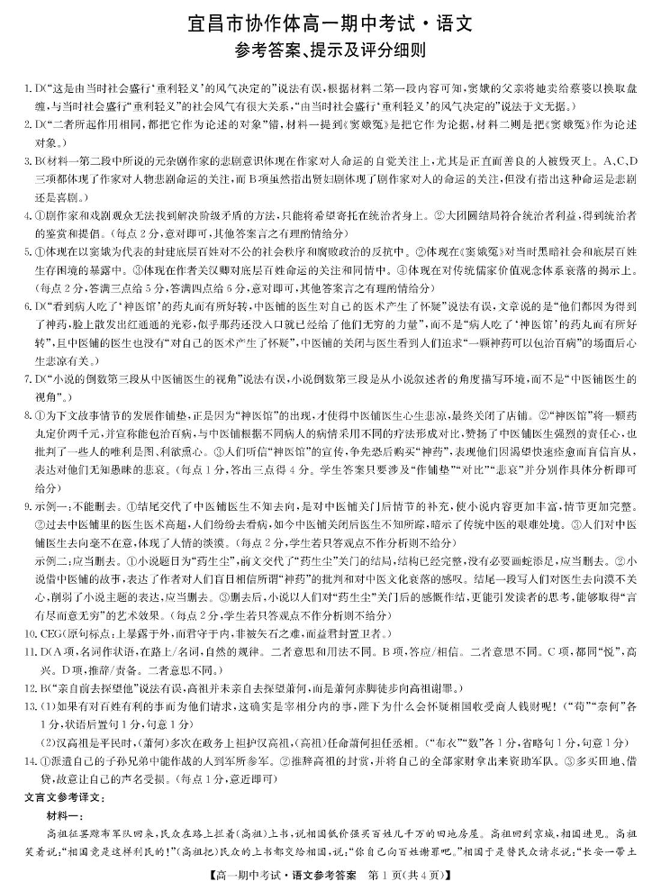 湖北省宜昌市协作体2024-2025学年下学期高一期中考试语文答案