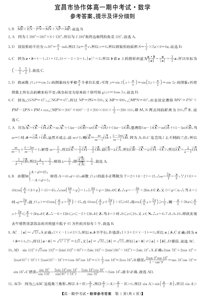 湖北省宜昌市协作体2024-2025学年下学期高一期中考试数学答案