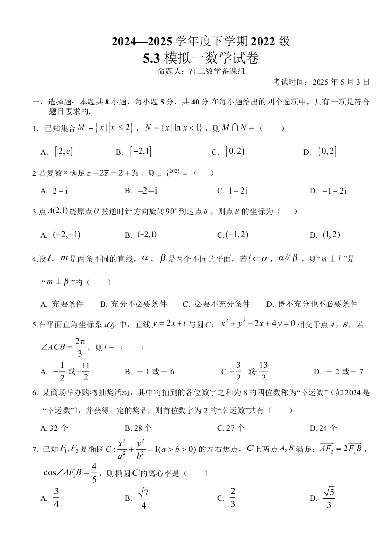 湖北省沙市中学2024-2025学年下学期五一节高三模拟预测数学