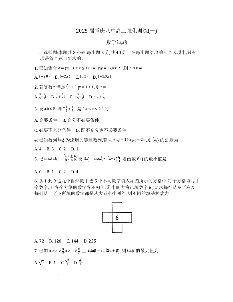 重庆市第八中学校2024-2025学年高三高考模拟强化训练(一)数学+答案