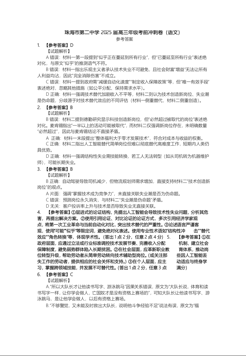 广东省珠海市第二中学2024-2025学年下学期高三高考考前冲刺语文答案
