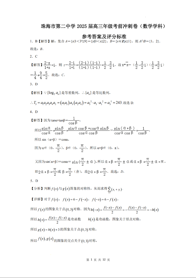 广东省珠海市第二中学2024-2025学年下学期高三高考考前冲刺数学答案