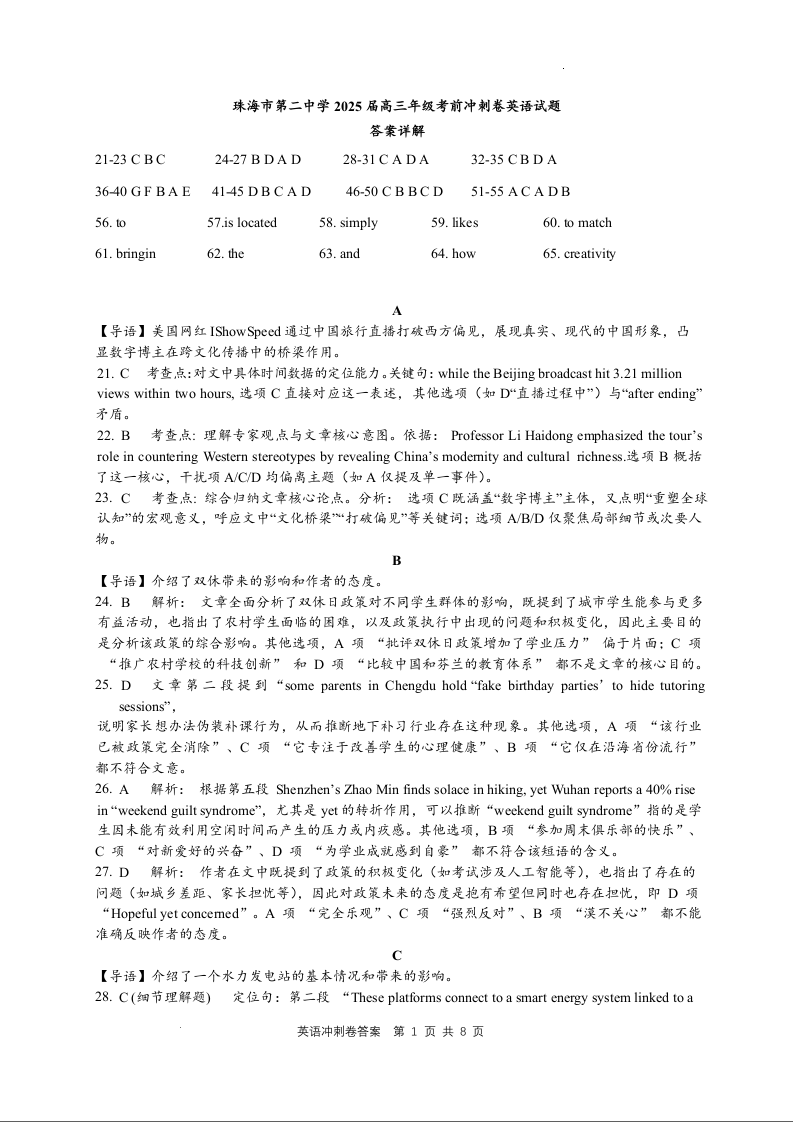 广东省珠海市第二中学2024-2025学年下学期高三高考考前冲刺英语答案