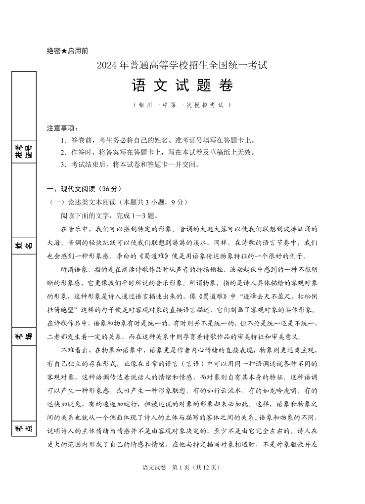宁夏回族自治区银川一中2024届高三下学期第一次模拟考试语文