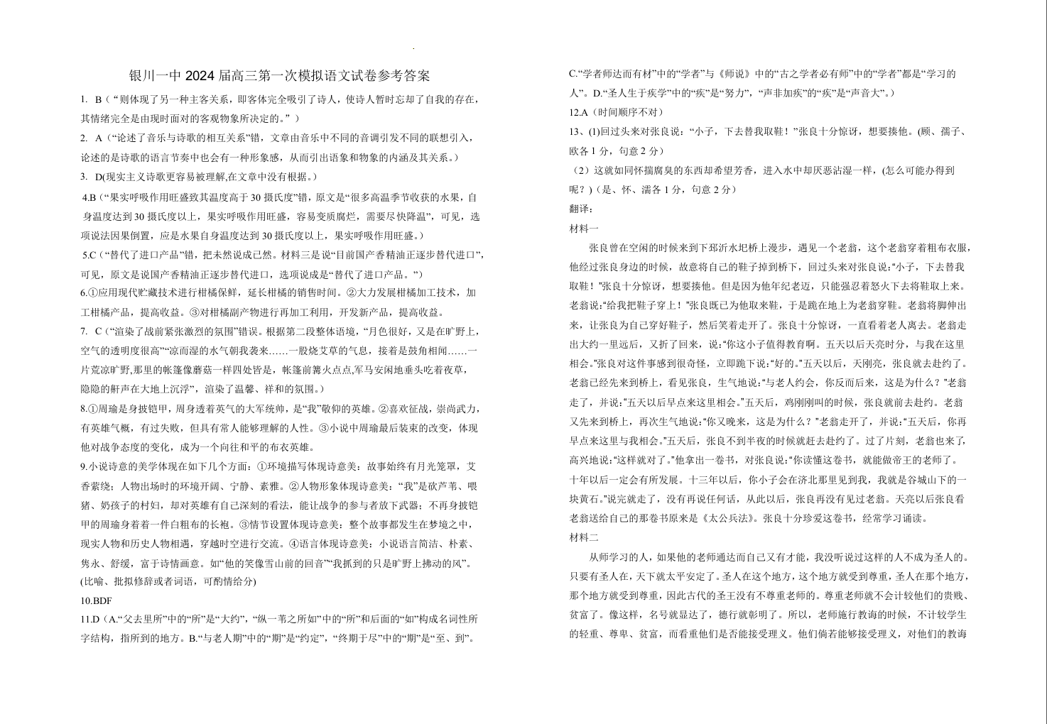 宁夏回族自治区银川一中2024届高三下学期第一次模拟考试语文答案