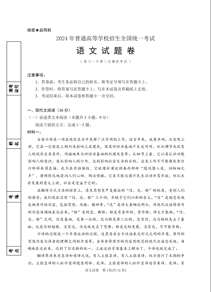 宁夏回族自治区银川一中2024届高三下学期第二次模拟考试语文