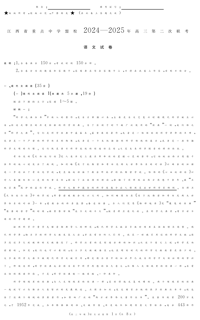 江西省重点中学盟校2024-2025学年下学期高三第二次联考语文