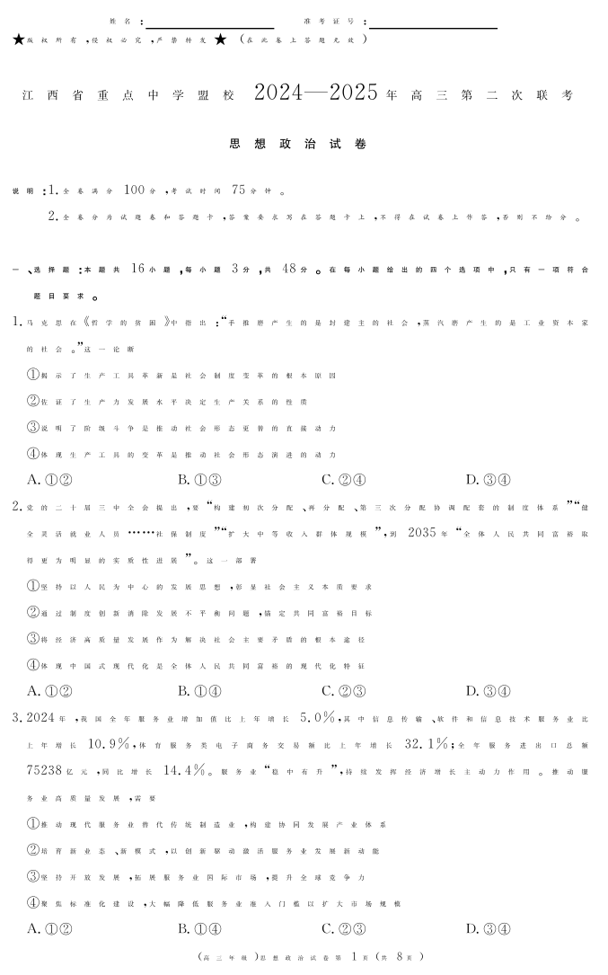 江西省重点中学盟校2024-2025学年下学期高三第二次联考政治