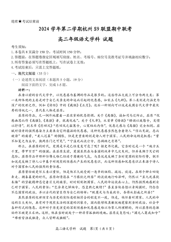 浙江省杭州市S9联盟2024-2025学年下学期高二期中联考语文