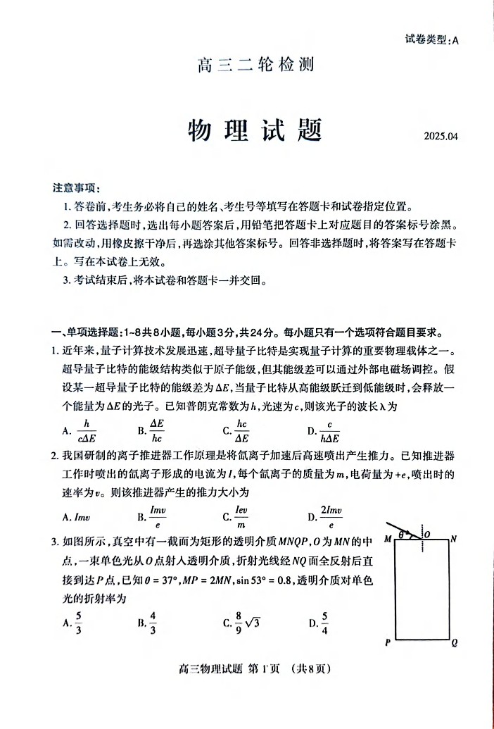 山东省泰安市2025届高三二轮模拟检测考试(泰安二模)物理