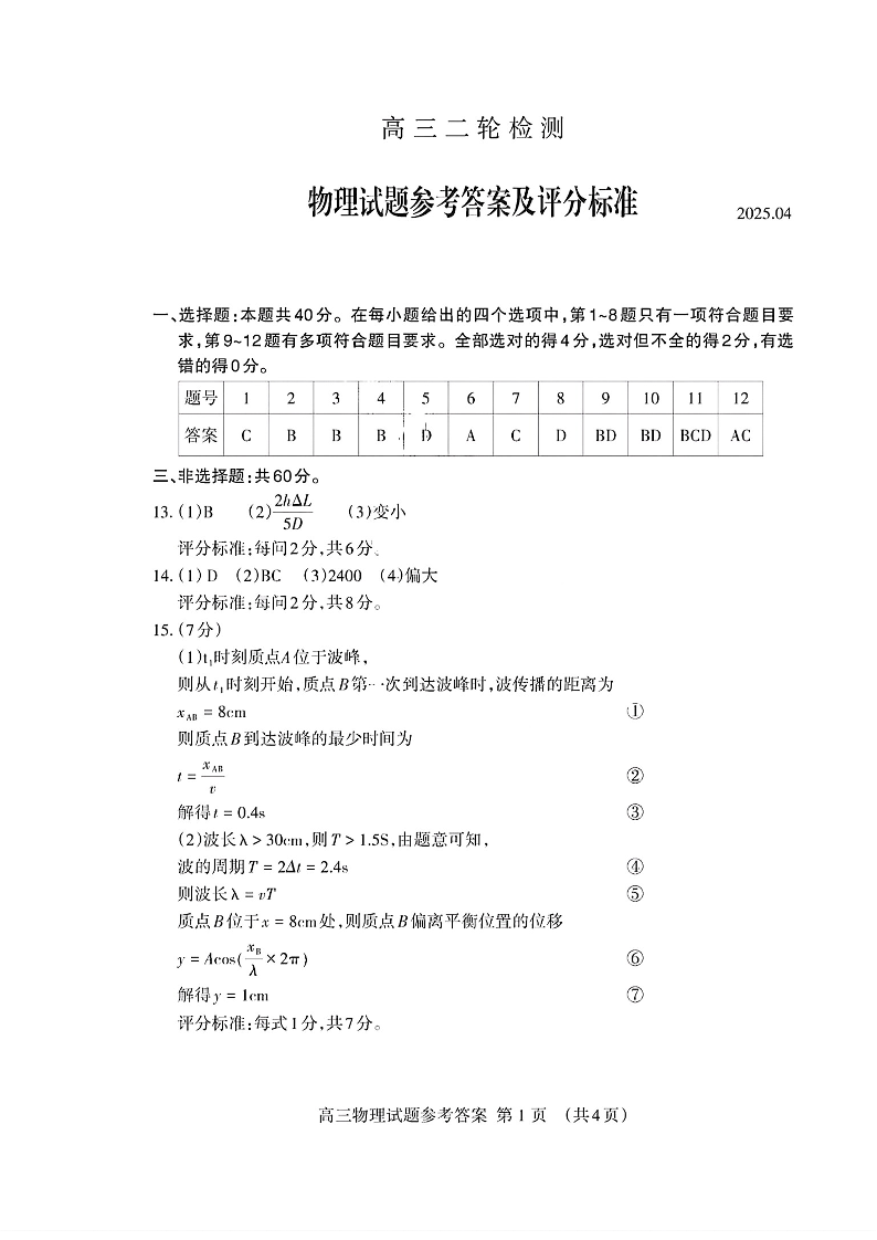 山东省泰安市2025届高三二轮模拟检测考试(泰安二模)物理答案