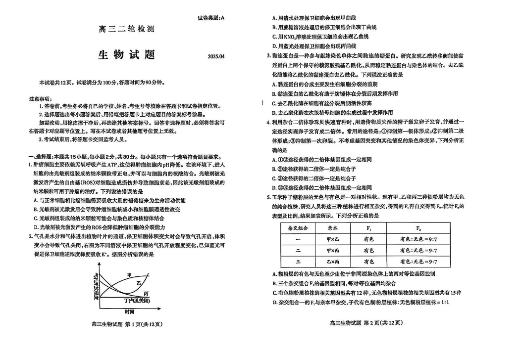 山东省泰安市2025届高三二轮模拟检测考试(泰安二模)生物