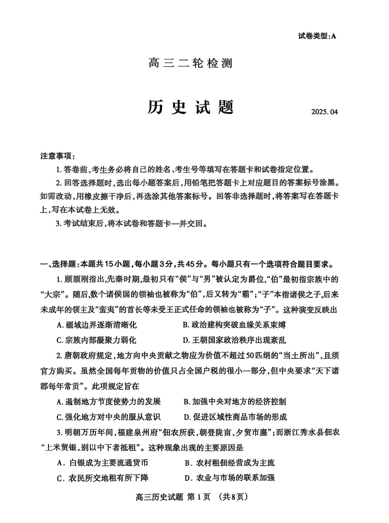 山东省泰安市2025届高三二轮模拟检测考试(泰安二模)历史