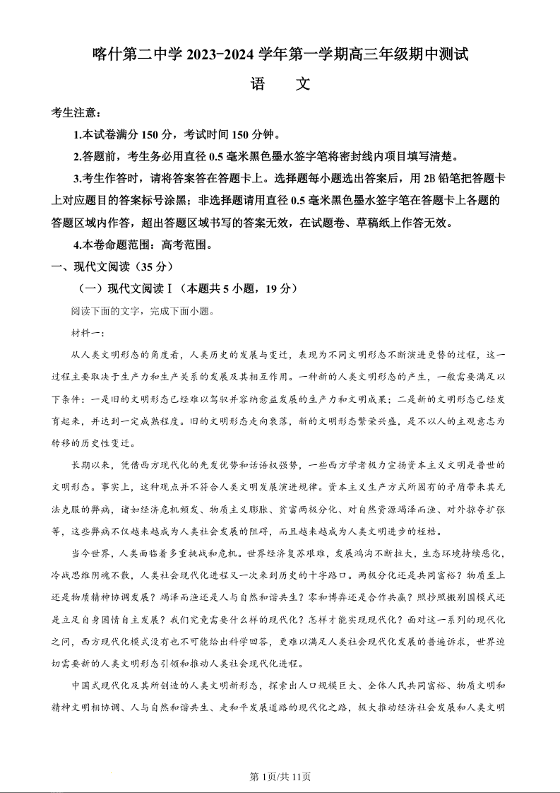 新疆喀什第二中学2024届高三年级上学期期中测试语文(原卷版)