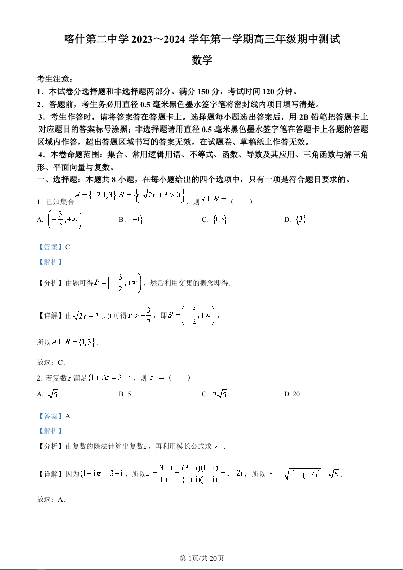 新疆喀什第二中学2024届高三年级上学期期中测试数学(解析版)